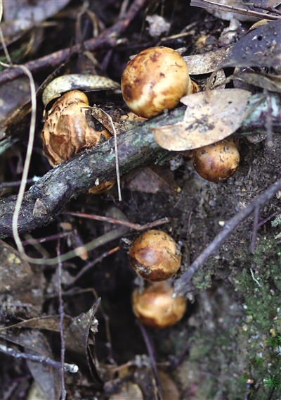 过去,当地村民管栗褐松口蘑叫“母鸡带小鸡”,因为它们总是一窝一窝地生长,且产量不菲。果然,在保护区的某个核心地段,栗褐松口蘑就如此这般地整窝生长着。生食一颗,清脆爽口,口齿含香。