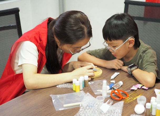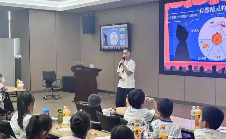 在《大有“蚊”章》课程中,实践队员借助《绿影国奇遇记》绘本引导孩子们通过观察插画,深入了解蚊虫知识。随后,在“自制驱蚊花露水”的实践环节中,队员带领孩子们将艾草、薄荷等天然植物装入瓶中,注入酒精后摇晃均匀,亲手制作出属于自己的驱蚊神器,让科学知识变得触手可及、生动有趣。
