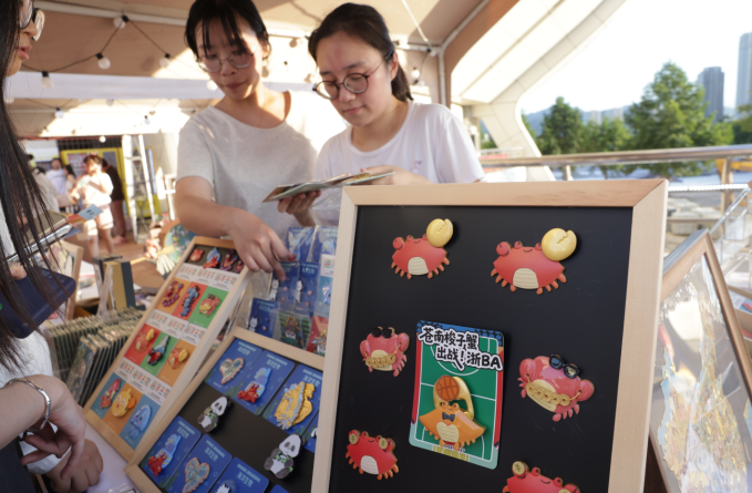 与“赛”俱进,苍南开发出了赛事文创产品。当“梭子蟹”苍南队在场内打得火热,“梭子蟹”队徽在场外也卖得火热。体育馆外的市集里,“金乡徽章厂·168文创”摊位正在出售苍南海洋生物系列徽章等超40种徽章,其中代表苍南队形象的“苍南梭子蟹出战浙BA”冰箱贴最为热销,赛前设摊约一小时就卖出了约30个。