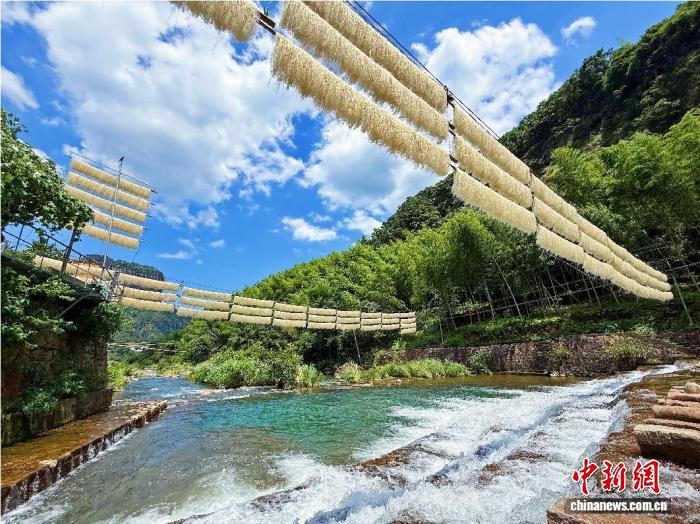 暑期是制作上山面的最佳时节。晨曦初露,龙西乡上山村潘海芬一家便将挂满湿面线的竹竿抬到溪边,利用传统索道晾晒。作为温州市级非物质文化遗产,上山面细若银丝、韧劲十足,是乐清特色美食大荆炒粉干的核心原料。潘海芬是制作上山面的第三代传人,她坚持纯手工制作,虽比机器烘制产量低,但口感更佳,深受市场青睐。