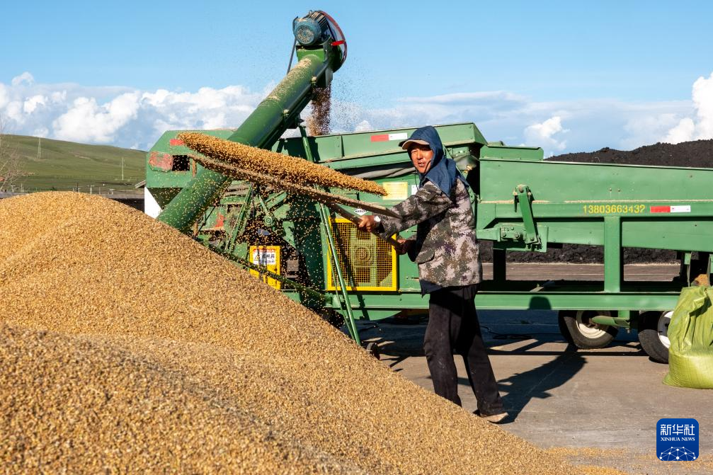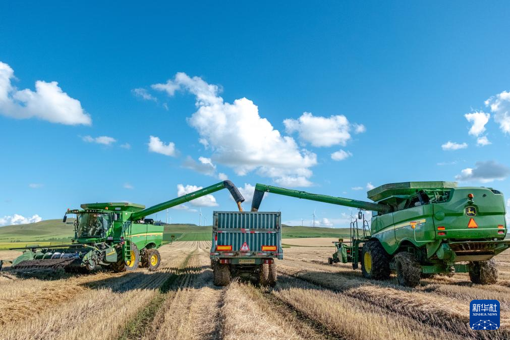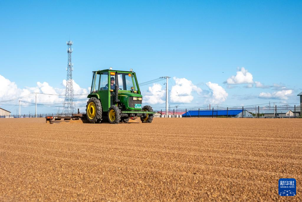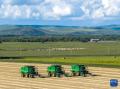 近日,位于内蒙古呼伦贝尔市额尔古纳市的呼伦贝尔农垦拉布大林农场19.22万亩小麦迎来丰收季,当地农民抢抓农时,以大规模机械化的方式开展收割、晾晒作业。新华社记者 马金瑞 摄