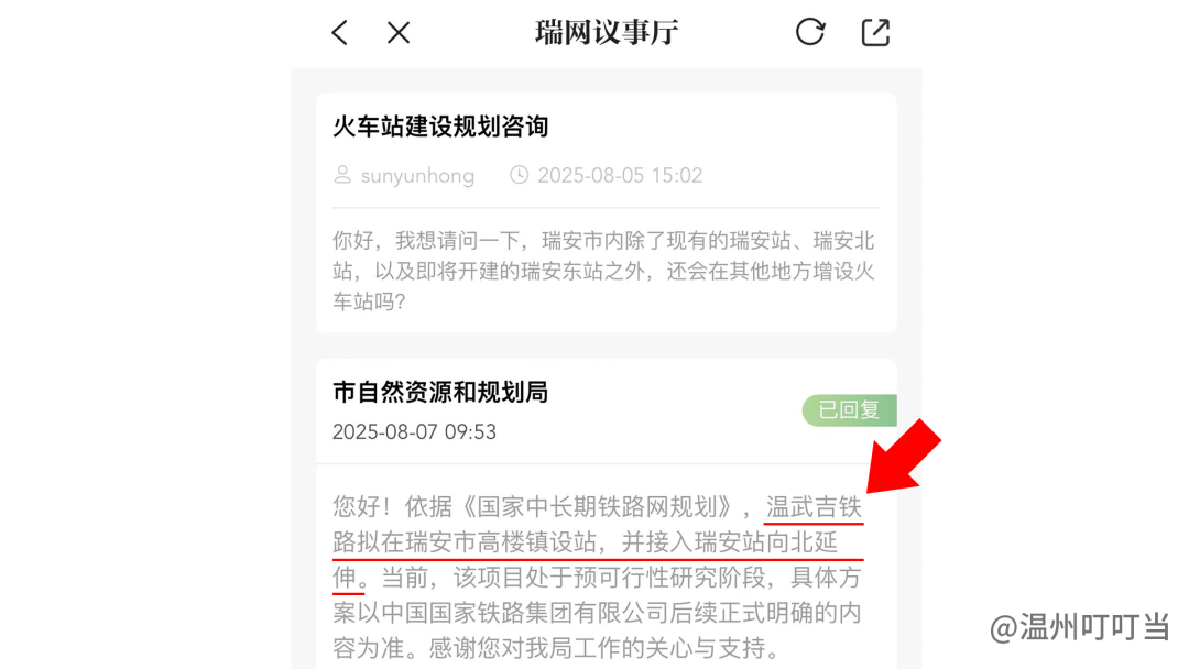 最近,小叮在瑞安网络问政平台“瑞网议事厅”上瞧见了这条重磅消息。瑞安市自然资源和规划局明确回复网友,依据《国家中长期铁路网规划》,温武吉铁路拟在瑞安市高楼镇设站,并接入瑞安站向北延伸。
