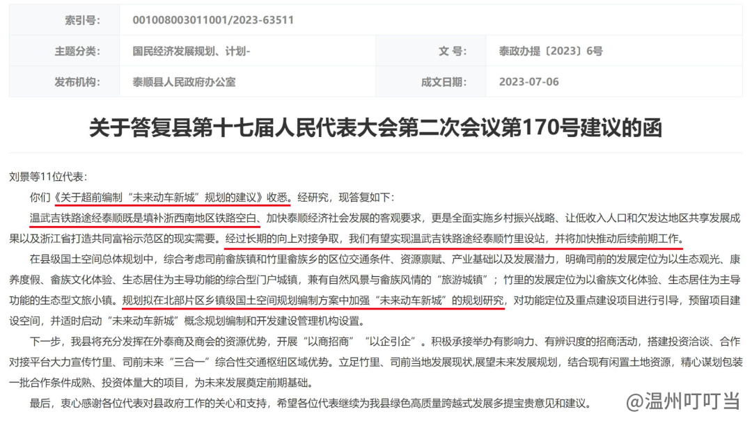 2023年,泰顺11位县人大代表提出了《关于超前编制“未来动车新城”规划的建议》。泰顺县府办回应,经长期向上对接争取,泰顺有望实现温武吉铁路途经泰顺竹里设站。