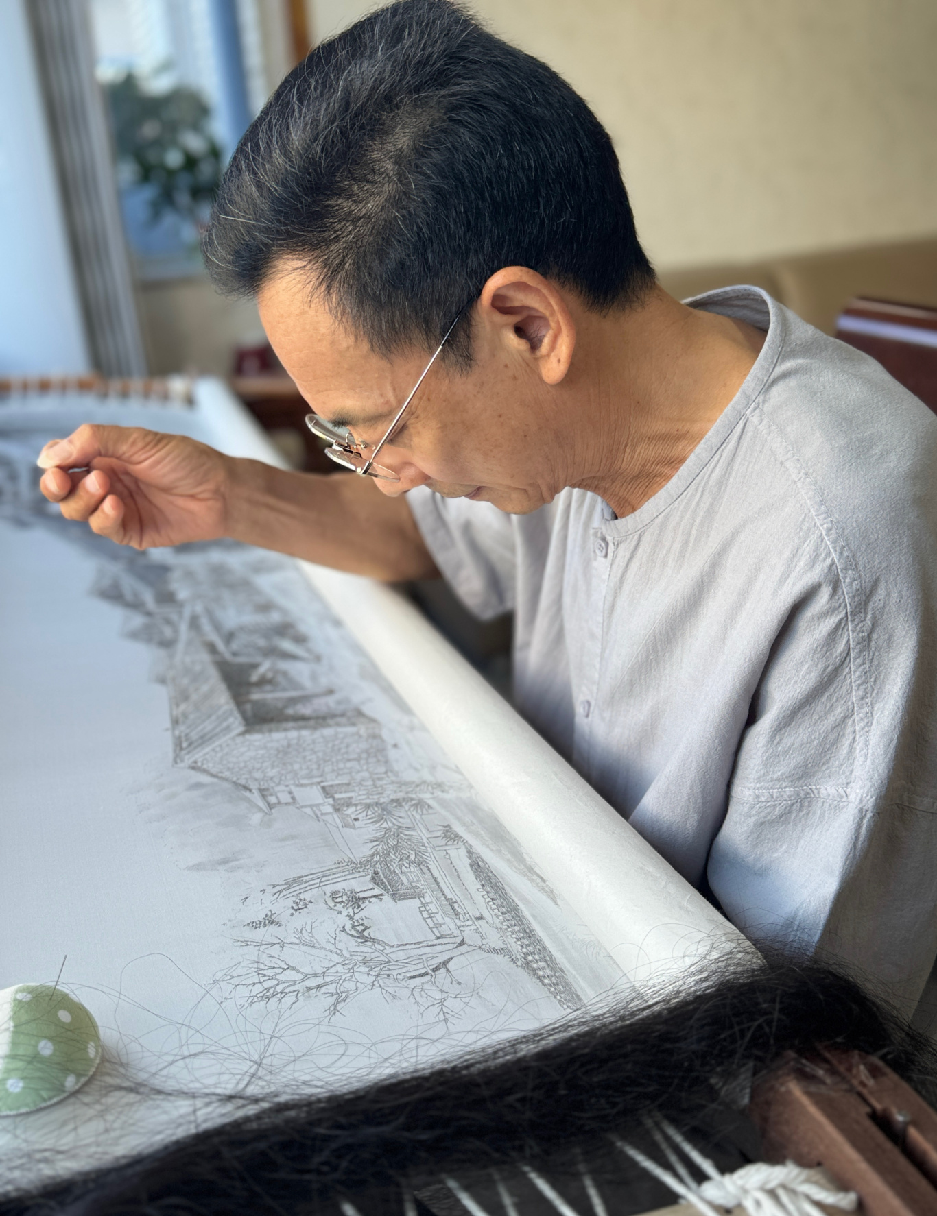 温州网讯 在国家级非遗代表性传承人孟永国家中,阳光倾洒于绣绷之上,他用针尖轻轻挑起一缕发丝。原本松散的青丝在其指尖缠绕转动,针下人物的眉眼轮廓沿着针脚渐渐晕染呈现,恰似水墨在宣纸之上慢慢舒展开来。“温州发绣的精妙所在,恰是以最为柔软的发丝,缝住悠长的文化根脉。”他抬眼之时,镜片后方那双凝注绣面达数十年之久的眼眸中,蕴藏着匠人独有的沉稳与淡然。