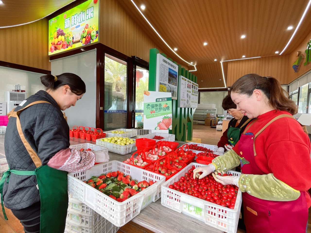 北塘村立足“山海田园”禀赋,打破单一花卉种植与果蔬采摘的产业瓶颈,联合市场监管、农业农村、科技等部门,成立全省首个村级科技特派员服务基地。通过引入红颊草莓、甜橘柚等优良品种,建设智慧大棚,实现科学精细种植。其中,“北塘”牌红颊草莓斩获“2024浙江好草莓”银奖,农产品质量安全快检室实现果蔬“批批检”、合格率100%。2024年,北塘果蔬销售额突破2300万元,同比增长超30%。