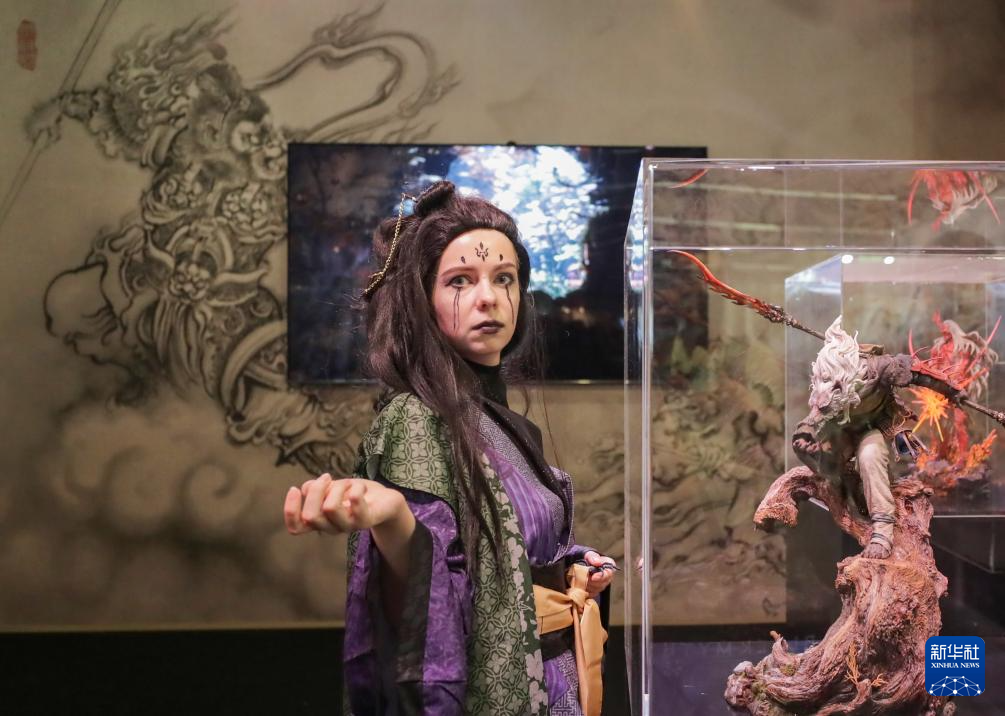 8月20日,在德国科隆,一名《黑神话:悟空》游戏角色扮演者在游戏科学展台与模型合影。