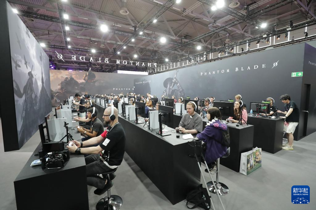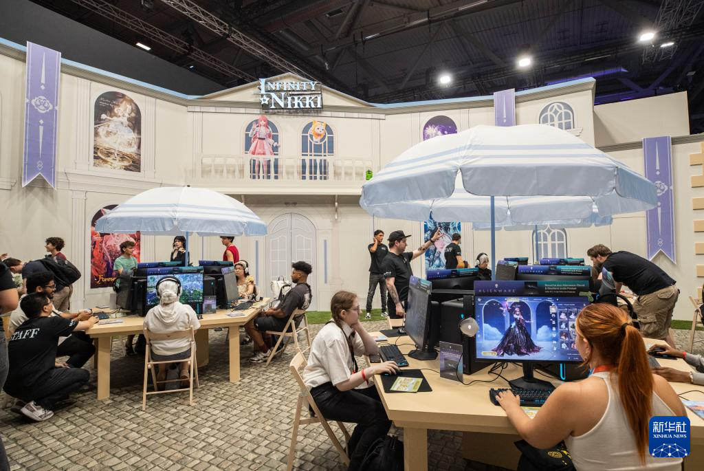 8月21日,在德国科隆,参观者在科隆游戏展叠纸游戏展台试玩游戏《无限暖暖》。