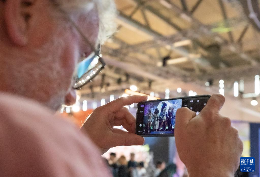 8月21日,在德国科隆,一名参观者在科隆游戏展米哈游展台拍摄游戏角色扮演者。