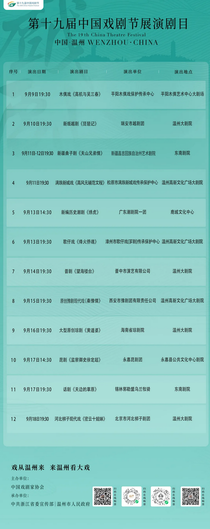 温州网讯 9月9日至18日,由中国戏剧家协会精心遴选的第十九届中国戏剧节12部戏剧精品,将在温州集中展演,为市民和游客带来一场高规格、多元化的戏剧盛宴。展演期间,我市特别推出“一张机票免费看大戏”活动,凭抵温的一张机票可免费兑换一张7天内的任一展演剧目门票,12部戏剧共计1000张门票可供兑换,先到先得,兑完为止。