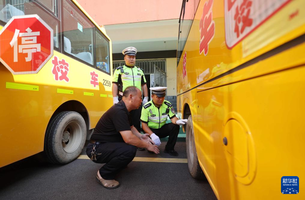 8月26日,在山东省临沂市沂南县铜井镇鲁家庄中心小学,沂南县公安局交通管理大队辅警在检查校车轮胎纹路。