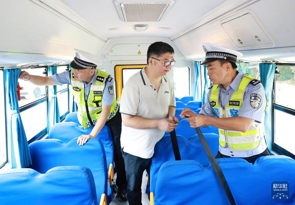8月26日,湖北省武汉市硚口区交通大队民警对校车进行安全检查。