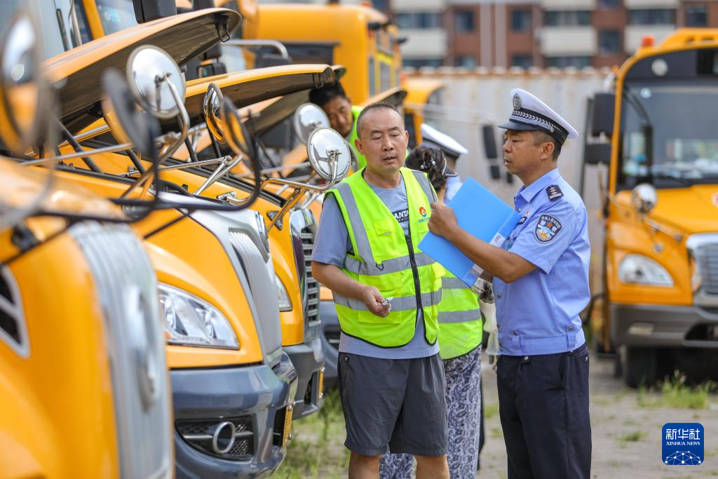 8月26日,山东省青岛市公安局交通管理支队李沧区大队民警对辖区校车车况进行检查。