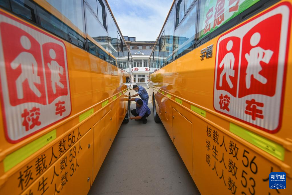 8月26日,在山东省青州凯程公共交通股份有限公司,技术人员对校车进行安全检查。