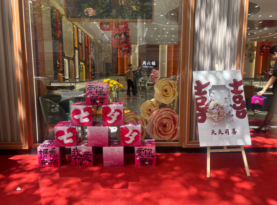 品牌门店内粉色气球、爱心挂件、鹊桥布景随处可见