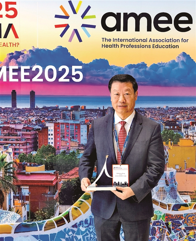 颁奖典礼上,宋伟宏院士作为获奖院校代表发表主题演讲。他说:“感谢AMEE组委会对学院育人模式的认可。两校合作育人模式开创中西医学教育合作办学的先河,是全球化背景下教育理念创新与资源整合的典范,更是人类文明互鉴的生动写照。这一成果得益于两校领导层的前瞻性战略眼光,凝聚着跨文化教育团队的智慧结晶。”