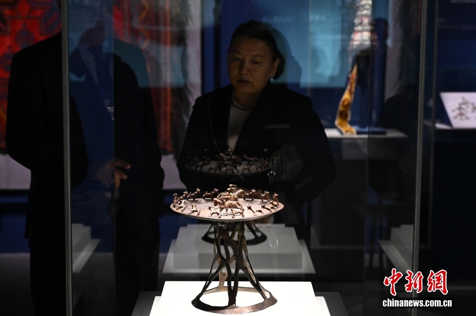 8月27日,“文明的星河——上海合作组织国家博物馆藏文物联展”在中国国家博物馆开幕。本次展览是上海合作组织国家文博机构首次在北京举办文物联展,展览以“上海精神”中的“尊重多样文明、谋求共同发展”为主题,精选上合组织各成员国10家文博机构的文物珍品220件(套)。图为参观者在国博观看展出的带骑马人像和动物小像的仪式用铜灯(复制品,哈萨克斯坦)。