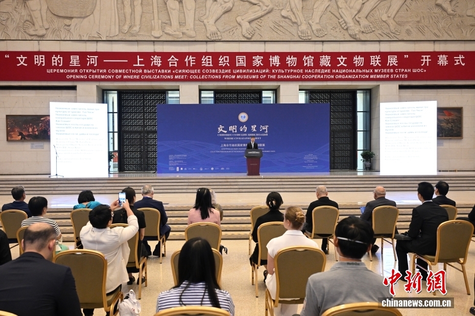 8月27日,“文明的星河——上海合作组织国家博物馆藏文物联展”在中国国家博物馆开幕。本次展览是上海合作组织国家文博机构首次在北京举办文物联展,展览以“上海精神”中的“尊重多样文明、谋求共同发展”为主题,精选上合组织各成员国10家文博机构的文物珍品220件(套)。图为开幕式现场。