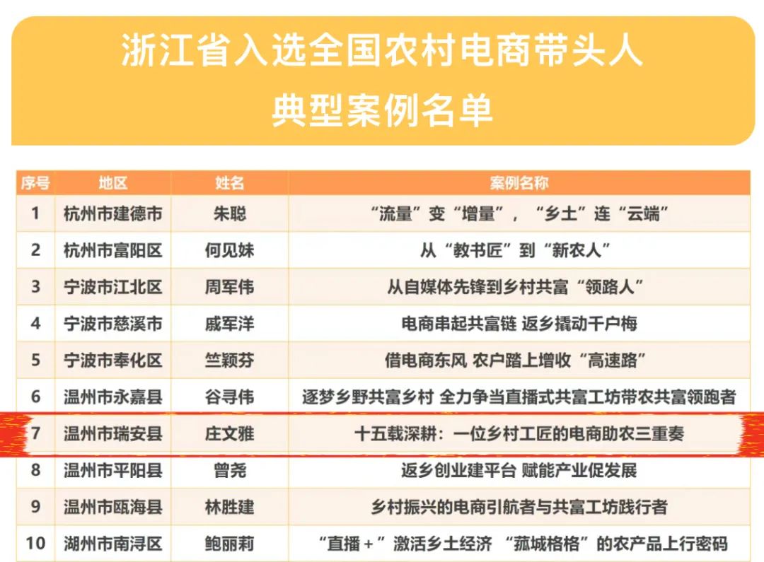 近日,商务部公布2025年全国农村电商带头人典型案例名单,瑞安草根工社负责人庄文雅榜上有名。