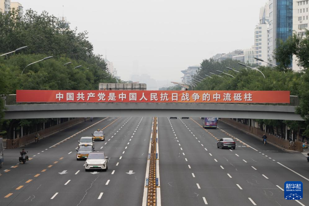 8月29日在复兴门外大街拍摄的纪念抗战胜利80周年主题横幅。