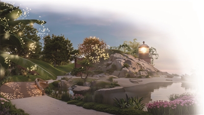 转——山合海会。继续向前,是岛礁与海相会之处,百年灯塔立于前方,指引光明之未来。通过灯塔进入隐藏于山体岛礁之中的舟山园展馆,游客将通过裸眼3D影像,了解舟山的古往今来和“海上花园”城市建设成果。