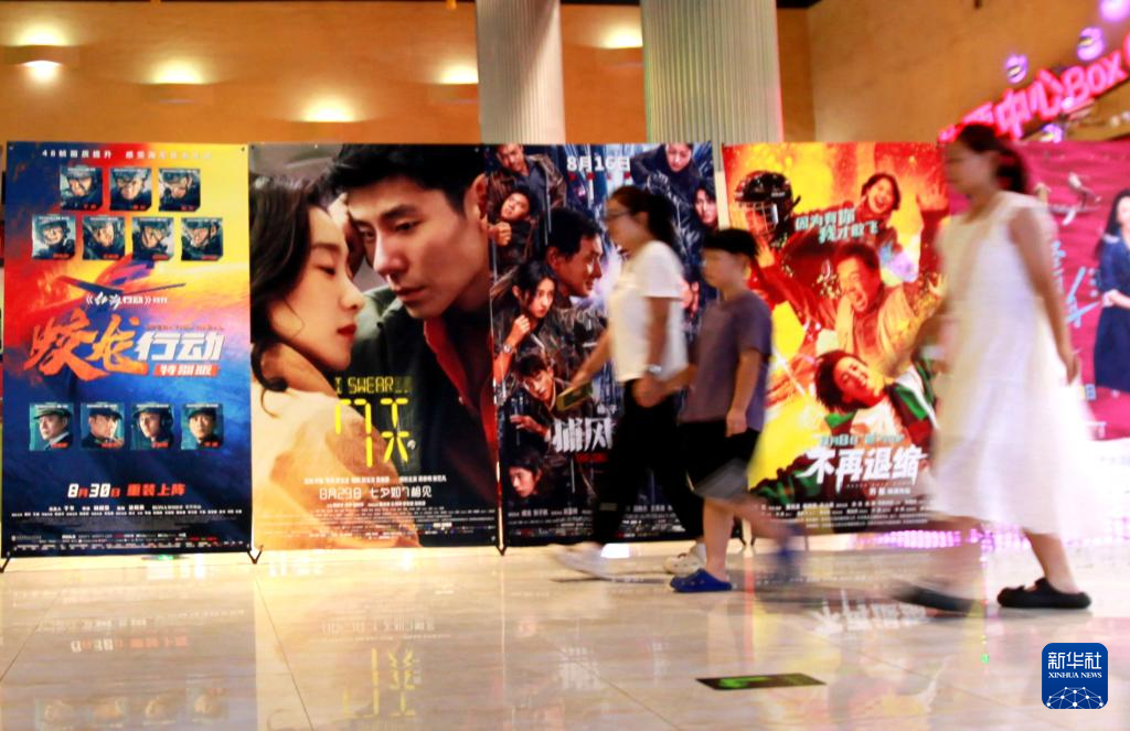8月30日,在山东省临沂市平邑县时代国际影城,观众从电影宣传海报前走过。新华社发 (武纪全摄)