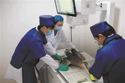 工作人员对一只磐石灰鹅拍X光