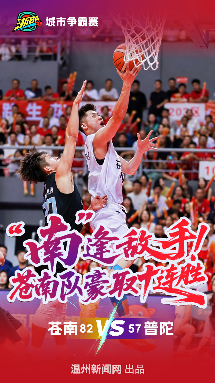 温州网讯(记者 温婉)今晚,浙BA城市争霸赛在苍南县体育中心体育馆继续展开,主场作战的苍南队迎战普陀队。比赛中,苍南队状态火热、配合默契,凭借出色发挥以82:57战胜对手,斩获十连胜。