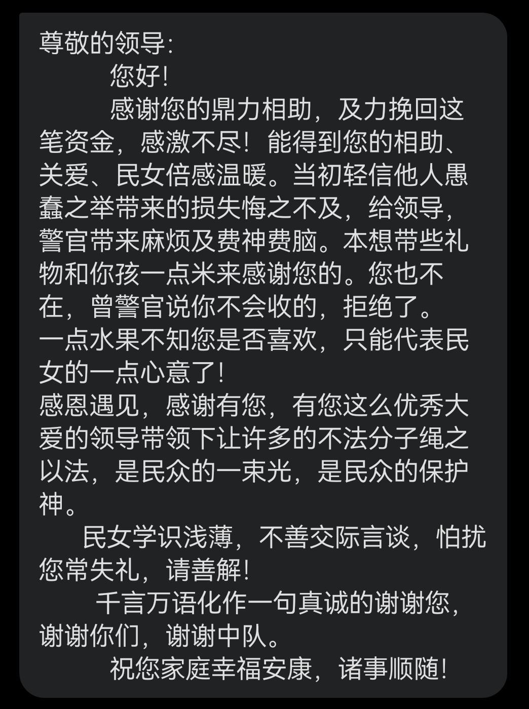 “感谢您竭力挽回这笔资金,感激不尽!”“能得到您的相助与关爱,民女倍感温暖。”近日,瑞安塘下女子在拿回被骗的15万元后,激动地给瑞安市公安局刑侦大队塘下中队民警曾一伟发去感谢短信,字里行间满是对警方的认可。