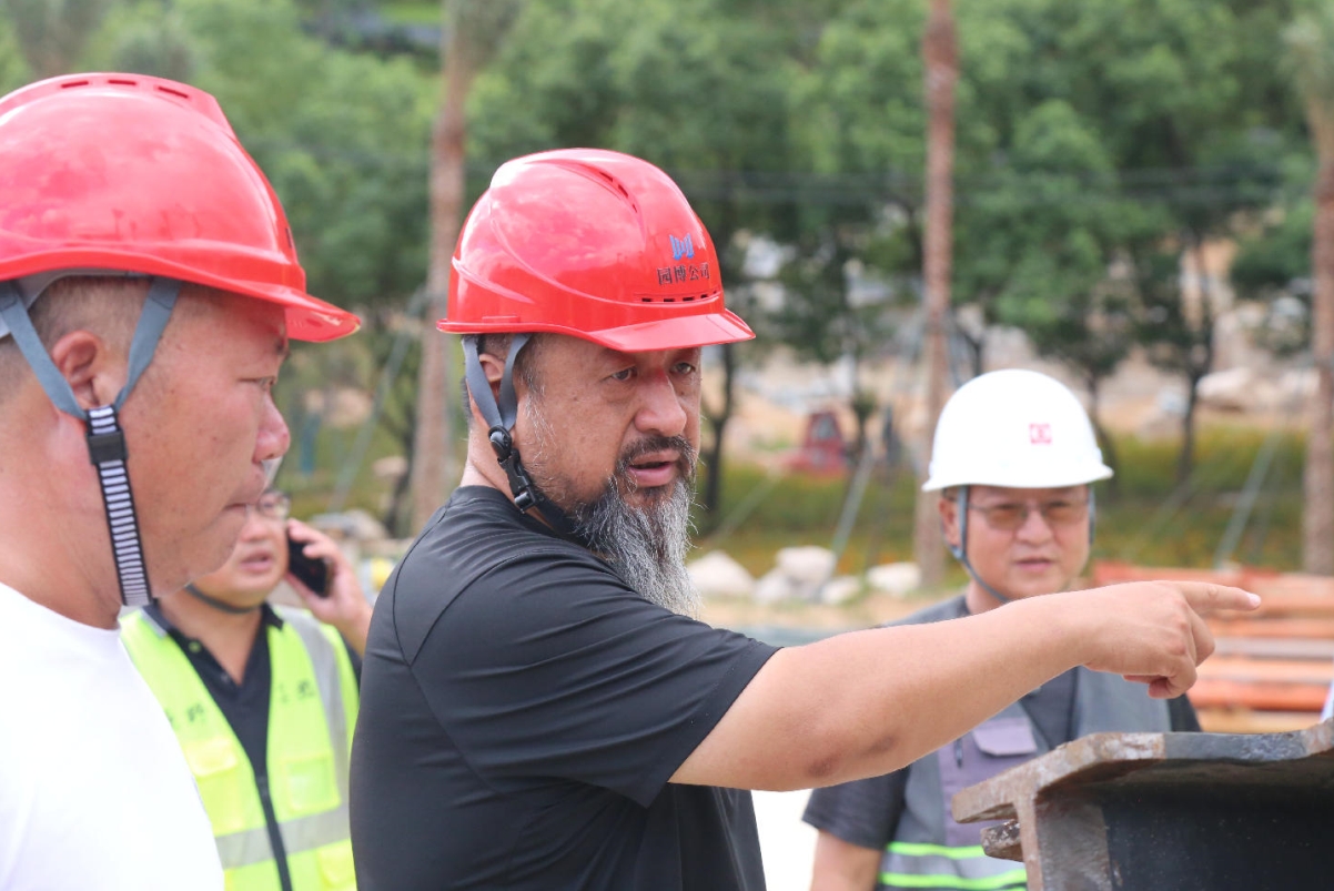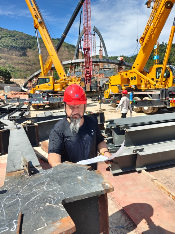 炎炎烈日下,上午巡检完巨型拱预埋件,他的T恤工装已被汗水浸透;下午紧盯双曲拱梁钢筋绑扎,新换不久的 T 恤又能拧出水来;待到深夜协调混凝土浇筑,第三件T恤早已黏在身上,宛如“铠甲”。车里备用的三套衣服,是他与工程赛跑的“战袍”。同事常打趣:“他用汗水为这座‘植物宫殿’浇筑钢筋铁骨。”而他总是简单回应:“衣服湿了能换,工期耽误不得。”话音刚落,孔鹏抹了把胡子上的汗水,又转身扎进“钢构丛林”。