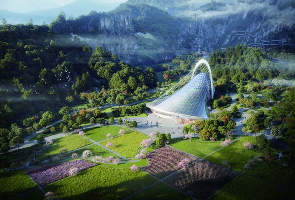 作为园博园南园的地标性建筑,“花园生活馆”以“盛世之贝”为设计理念,创新采用网壳加拉索的结构形式,打造出独特的拱形元素与轻盈向上的建筑造型;外立面选用高透超白玻璃与少量浅色金属铝板,整体形似一颗孕育明珠的优雅贝壳,镶嵌在绿谷之中。
