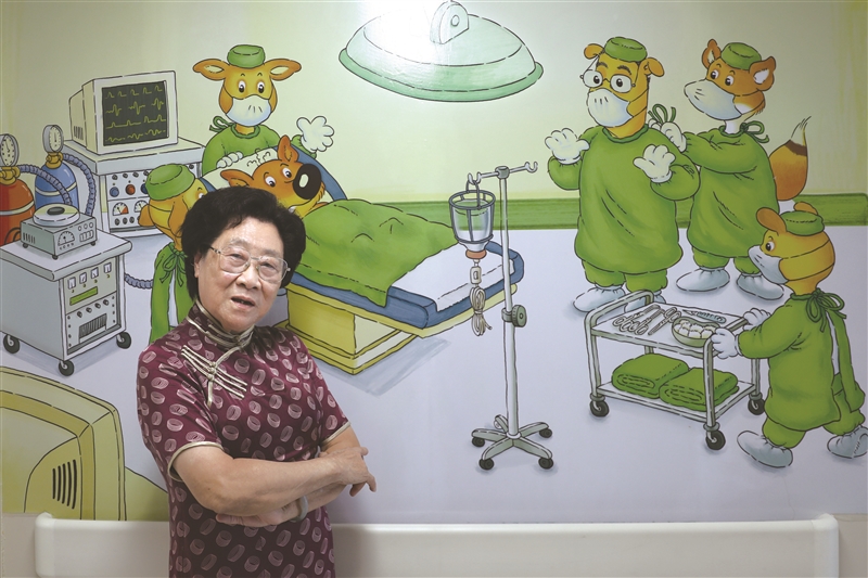 儿童心血管科病区,项如莲教授在充满童趣的漫画墙前留影。 刘中立/摄