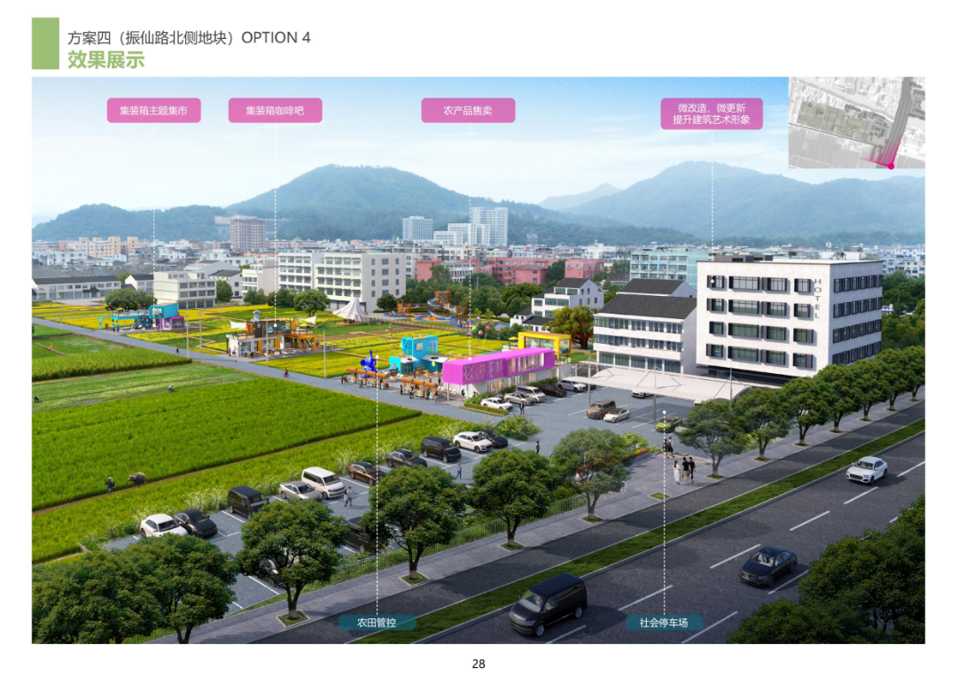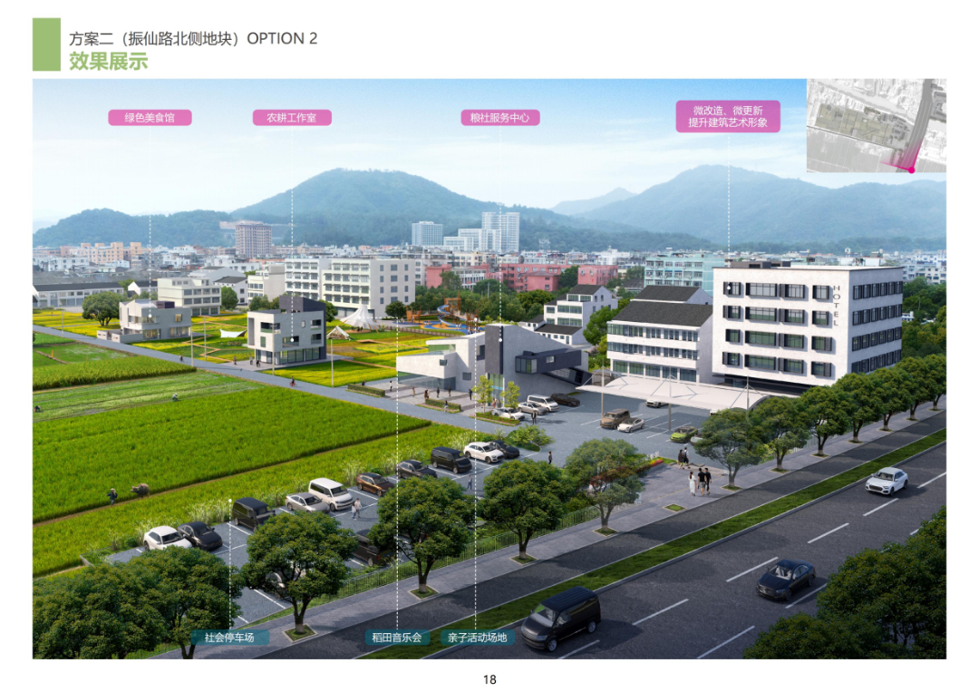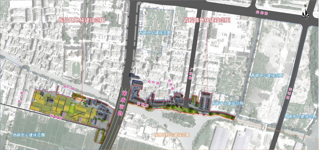 振仙路北侧地块位于园博园主入口旁,占地面积2383㎡,建筑面积6204㎡。该区块以郭溪粮食功能区为载体,秉持“农田交互体验”理念,以沉浸式体验农耕文化为主题,打造桑田农旅新名片;霞榕路北侧地块与园博园主场馆隔溪相望,占地面积4671㎡,建筑面积13340㎡,深挖郭溪历史文化,化水乡村落为笔,描绘“郭溪烟火与诗”的美丽篇章。