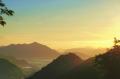 山顶上,云雾缭绕,阳光穿透云层,形成一道道金色的光柱,直插江面,如梦如幻。