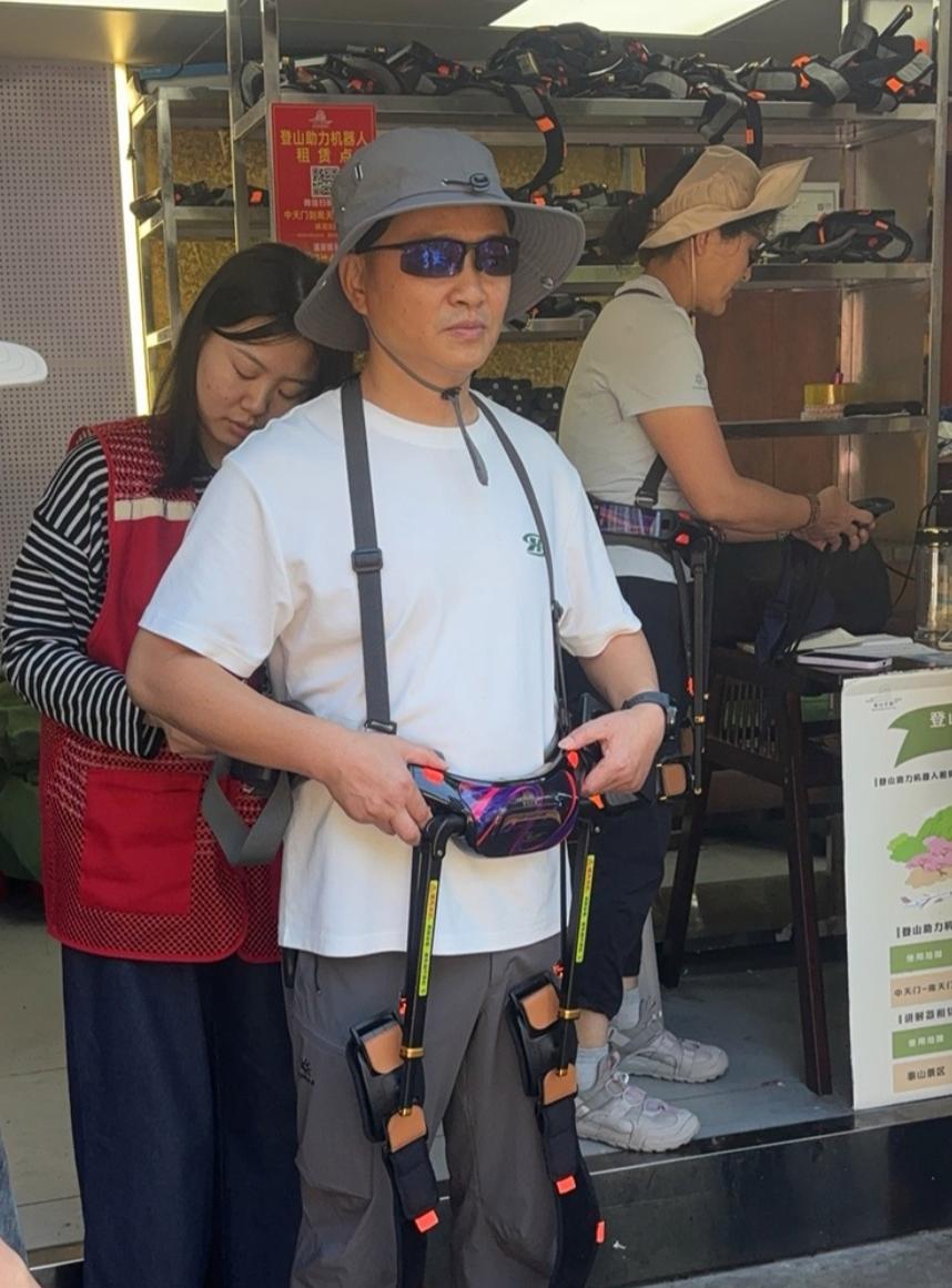 在登山助力机器人中天门租赁服务点,工作人员正在帮游客穿戴设备 听上去“懒人友好”,实际充满人性化考量。“泰山几乎所有景点都在步道上,坐索道只能看见满山柏树,走阶梯是最佳选择。但台阶多且连续不断,很多游客爬到中天门就抬不起腿了。”泰山文旅集团登山助力机器人运营部经理王锦程解释道。