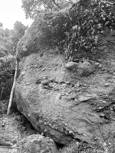 崩塌堆积红层砂岩:山谷中堆积大量的巨石,分布面积约300平方米,属于崩塌地质遗迹。巨石边部棱角突出,大者长轴约8米,岩性为早白垩世(约1.1亿年前)紫红色砾岩、砂砾岩,其沉积时代略早于雁荡山火山首次爆发时间。该崩塌堆积的成因是崖壁在地震、流水等内外力作用下,岩块大量崩落,并堆积在溪谷之中,局部还形成崩塌堆积洞。