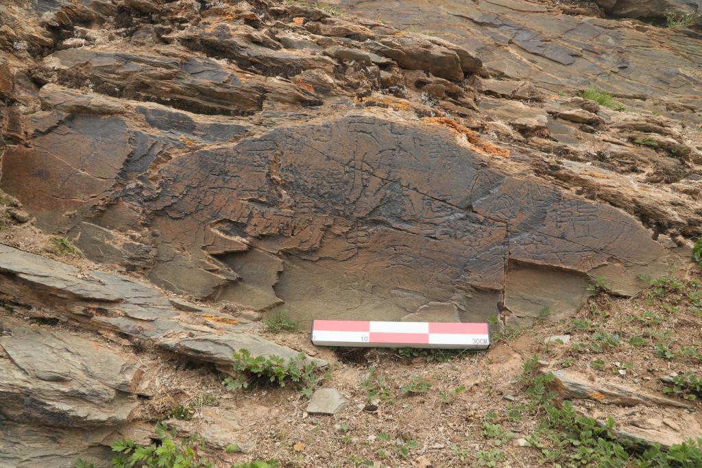 文物考古工作者于2023年7月在青海省玛多县扎陵湖畔对尕日塘秦刻石进行现场考察时拍摄的该刻石遗迹照片。新华社发