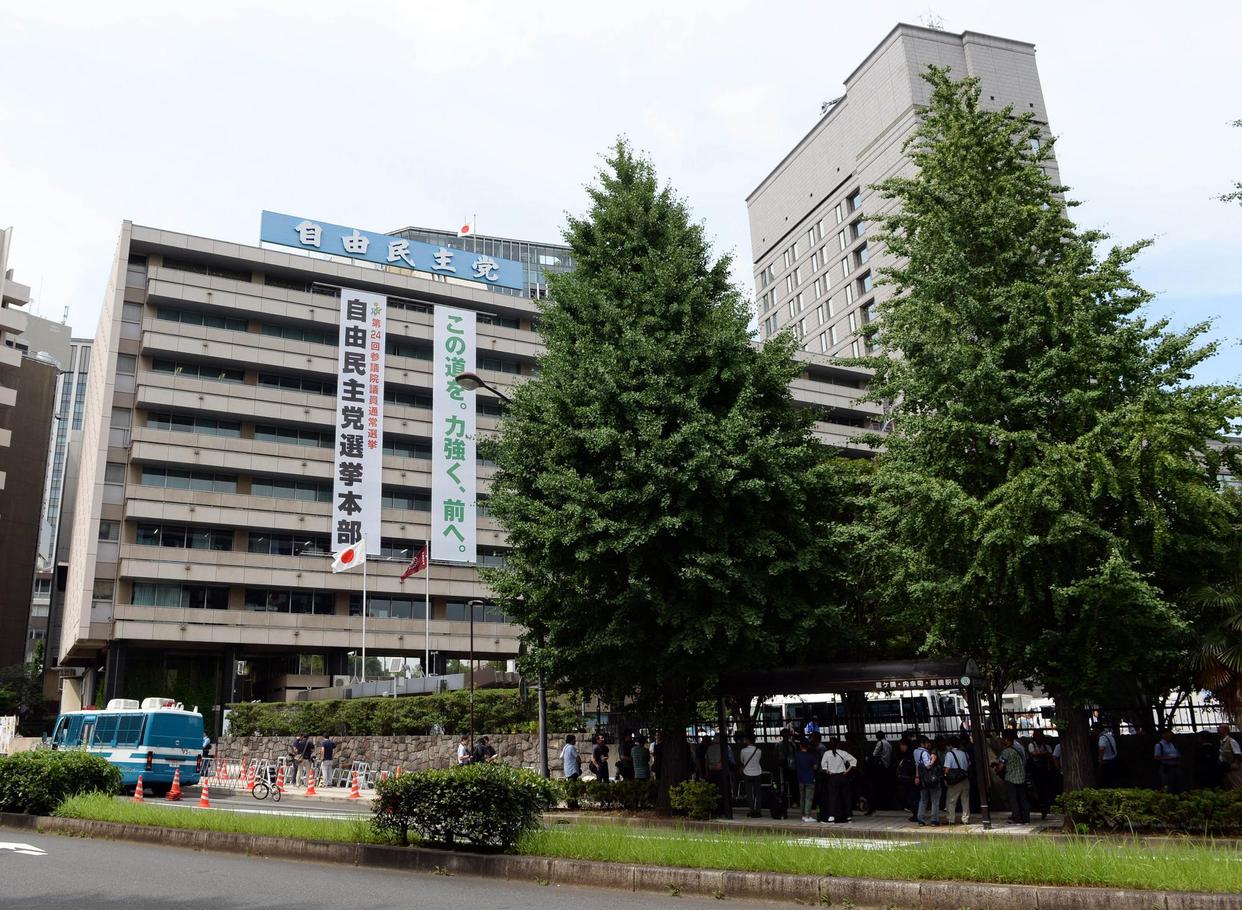 2016年7月10日,在日本东京,媒体记者排队等候进入自民党总部。新华社记者马平摄