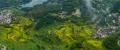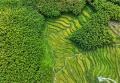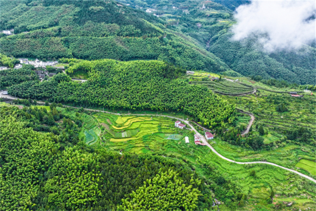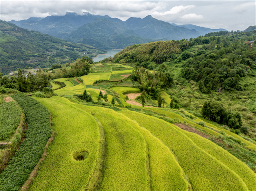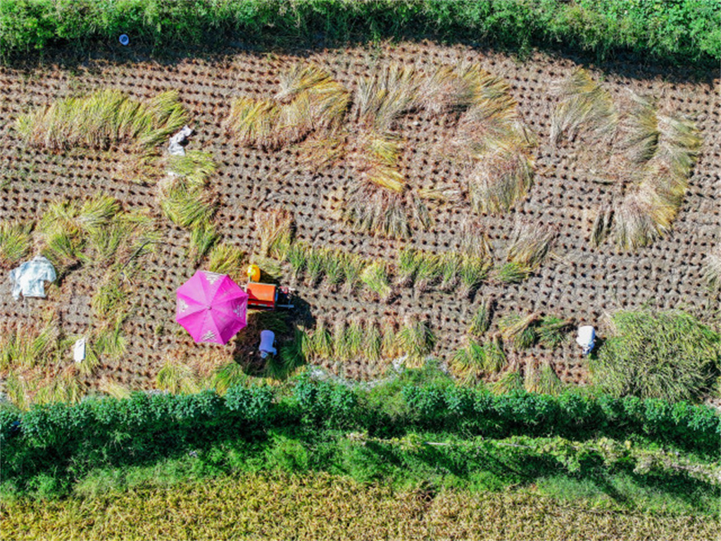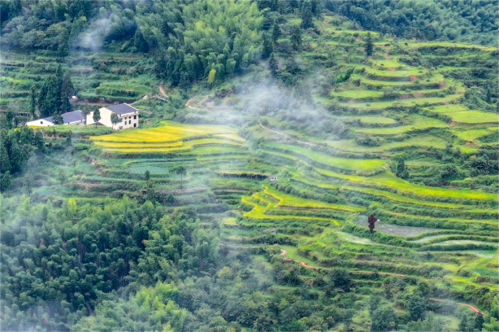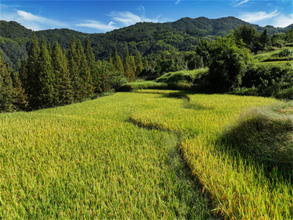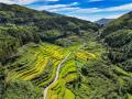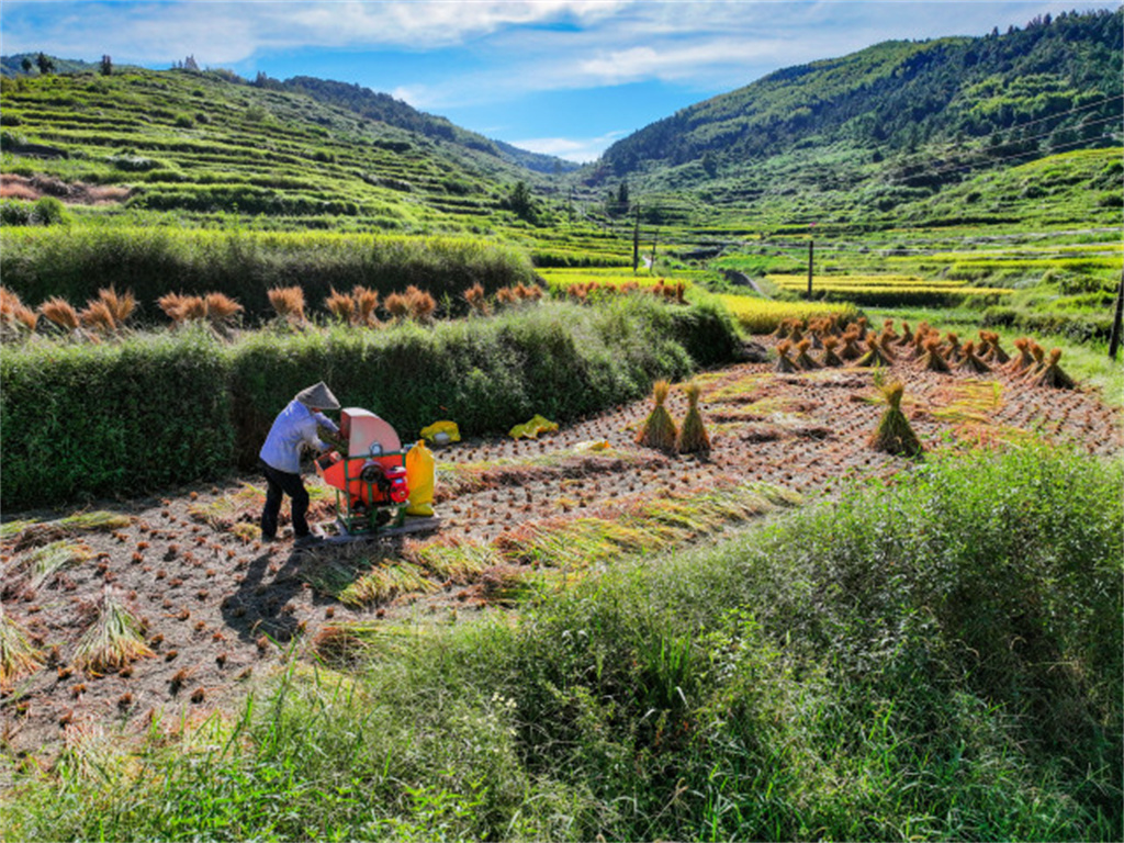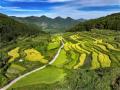 金黄稻浪叠翠山间,沉甸甸的稻穗在秋风中摇曳出丰收韵律,农户弯腰割稻,田间地头一派繁忙景象。