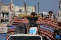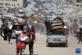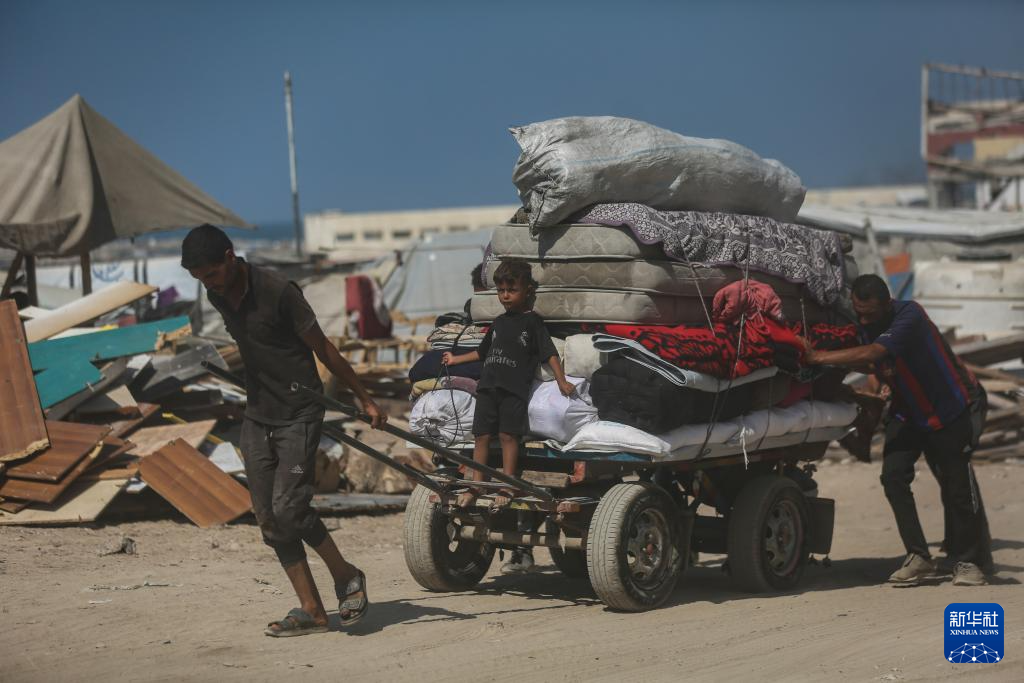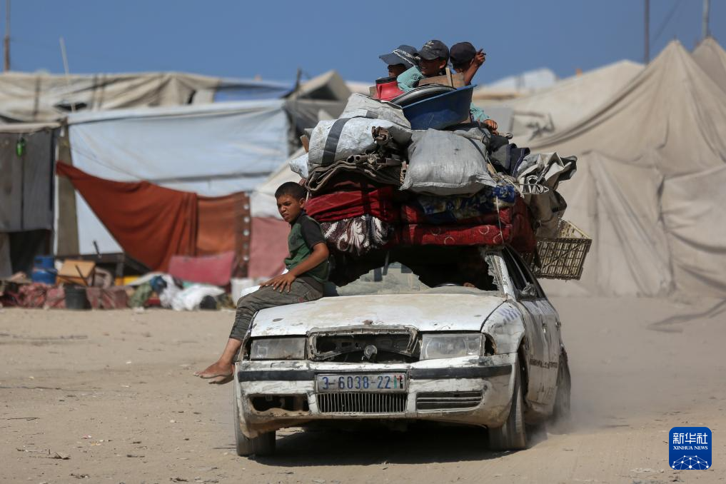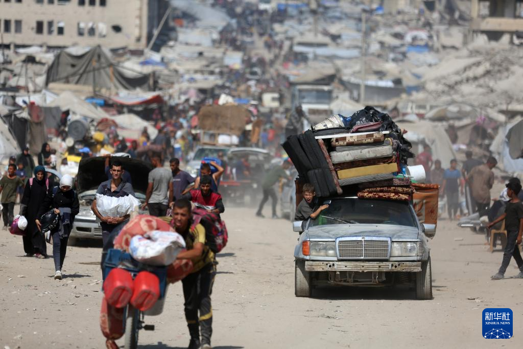 9月18日,在加沙城以西的沿海公路上,人们运载着生活用品,汇入人潮向南撤离。新华社发(里泽克·阿卜杜勒贾瓦德摄)