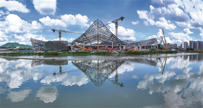 温州网讯 9月18日,建设中的温州园博园山水中国馆,建筑轮廓映水,与蓝天白云衬出灵动图景。山水中国馆是温州园博会的主展馆,位于温州园博园北园的北部。该馆屋面采用双曲弧形钢桁架结构,最大跨度42.49米,总用钢量约950吨。施工方通过数字化预拼装、智能登高车作业等实现毫米级精度,提前25天完成吊装,期间还保护了两株百年古榕树。下一步,项目将推进金属屋面、光伏等施工,计划12月完工。据悉,园博会结束后,该馆将作为永久性设施运营,打造“永不落幕的园博会”。