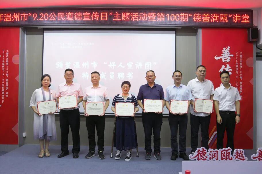 此次活动还为温州市“好人宣讲团”特邀成员、第二批“德善满瓯”宣讲团讲师颁发聘书,宋玲华、郑小侠、娄增材、曾庆明、林华、陈忠、王海英等“好人”代表,将持续宣讲“家风故事”,发挥榜样引领作用,让道德之声响彻温州。