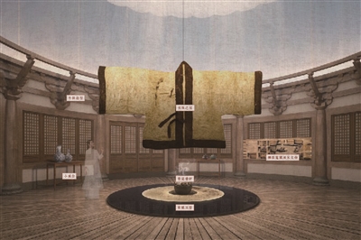 穿过石墙小院,映入眼帘的将是疏影暗香展区,那里会坐落核心建筑圆形焚香坛。焚香坛环以水池,南侧水面延伸至下沉式飞龙池,池畔点缀梅花,与远山湖景相映成趣。坛内主要展示和“宋服之冠”等文物相关的展品,焚香坛中心地面以投龙玉璧为意象,“玉璧”中心放置香炉焚香。届时,袅袅香雾缓缓上升,萦绕在“宋服之冠”展品周围,为宋韵文化增添独特氛围。