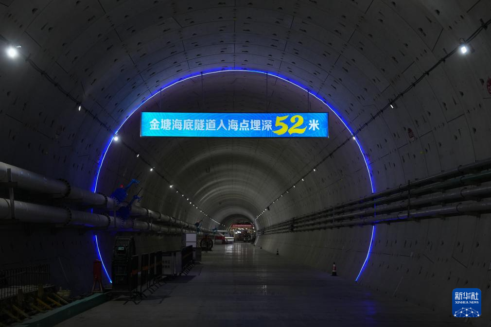 9月22日拍摄的甬舟铁路金塘海底隧道宁波侧施工现场,此处是海平面下52米深的隧道入海点。9月22日,在浙江省宁波与舟山间的金塘水道海平面下65米深处,国产超大直径盾构机“甬舟号”掘进里程突破2470米,标志着甬舟铁路金塘海底隧道宁波侧掘进过半,隧道建设取得阶段性进展。甬舟铁路金塘海底隧道西起浙江宁波市北仑区,东至舟山市金塘镇,全长16.18公里,是世界最长海底高铁隧道。新华社记者 黄宗治 摄