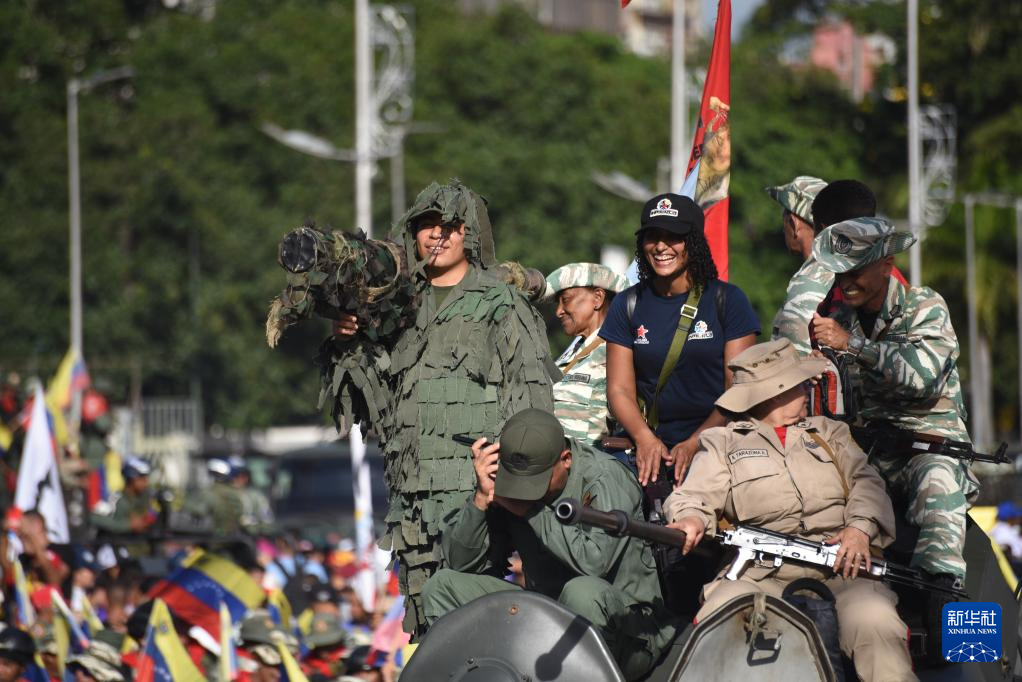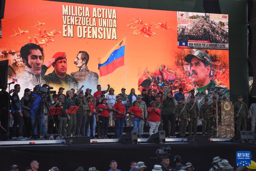 9月23日,在委内瑞拉首都加拉加斯,民兵组织成员挥舞委内瑞拉国旗参加游行。当天,加拉加斯举行大规模游行,呼吁保卫委内瑞拉主权与和平,反对美国在加勒比海域的军事威胁。