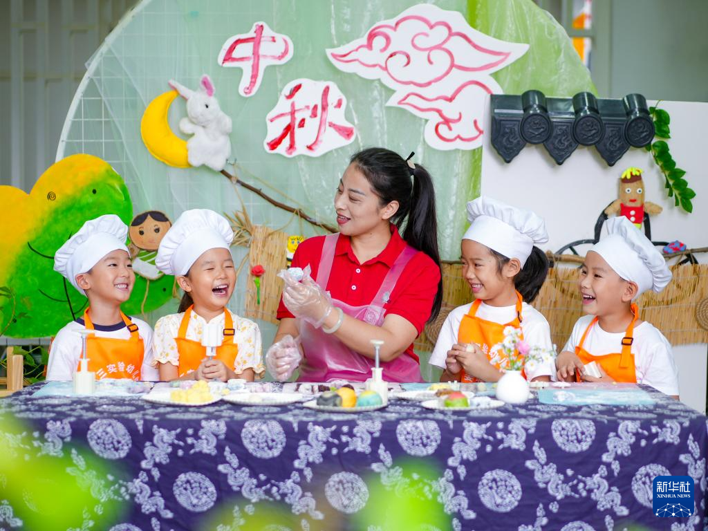 9月25日,在江苏省泰州市姜堰区第三实验幼儿园,小朋友们在老师的指导下学习做月饼。周社根 摄