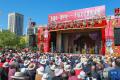 9月24日,在甘肃省平凉市绿地广场,演员在“庆国庆·度中秋”戏曲文化惠民演出现场表演。吴希会 摄