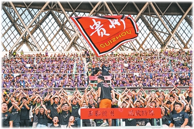 9月19日,2025城市足球邀请赛在贵州省贵阳市奥体中心体育馆开赛。图为观众在现场加油。新华社记者 杨文斌摄