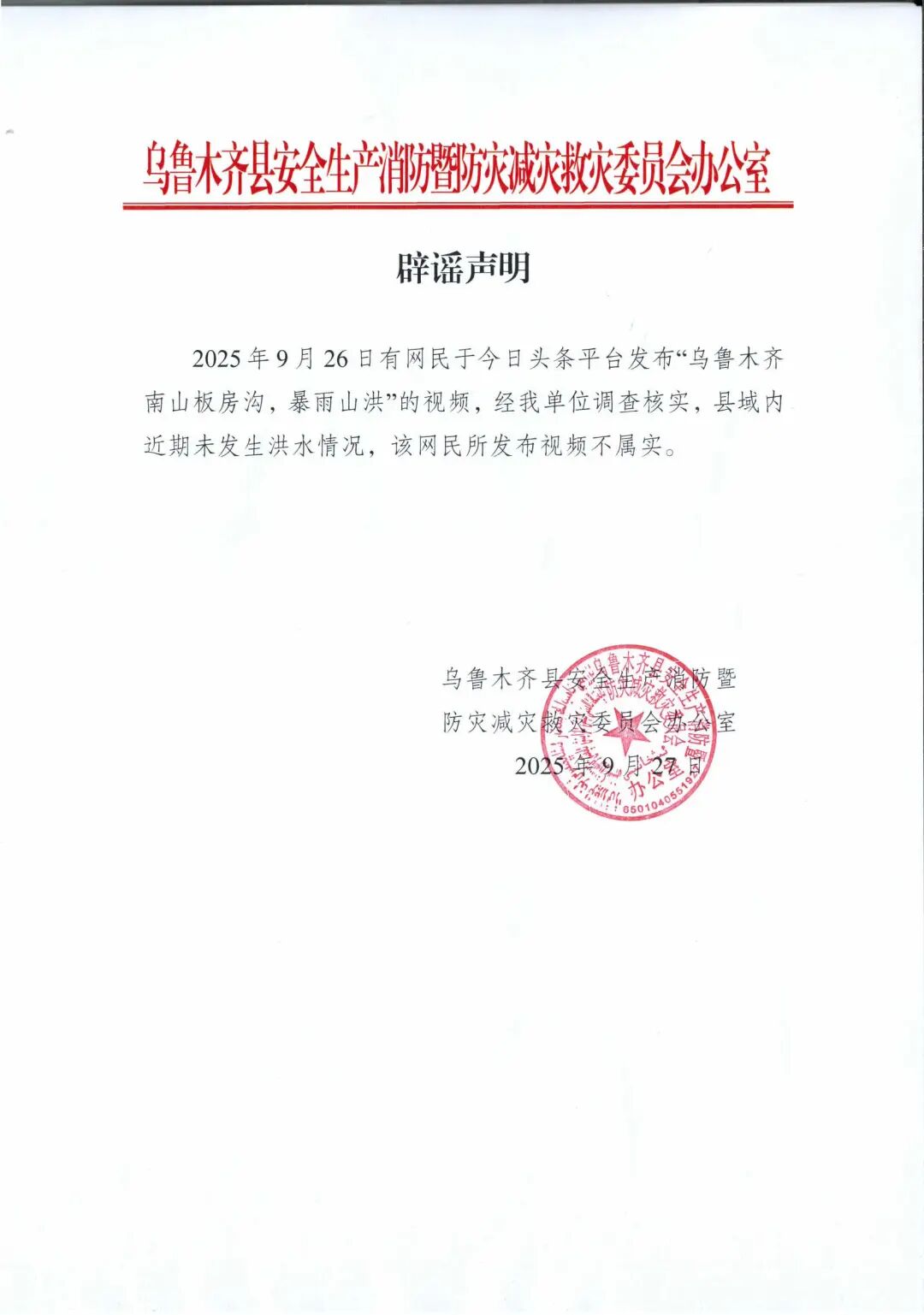 经乌鲁木齐县应急管理局安全生产消防暨防灾减灾救灾委员会办公室核实反馈:近期乌鲁木齐县域内未发生洪水,该网传信息系不实内容。