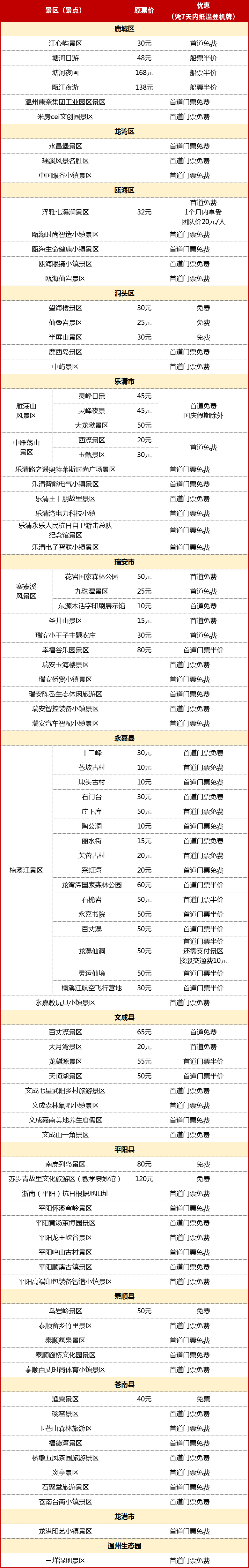 2025年,航空游客凭抵达站为温州机场的有效飞机票(电子票或登机牌)以及个人身份证件,7天(含当天)内可享受:30个收费景区景点免门票,13个景区景点门票和项目5折及以下优惠权益。温州全域可免费游览的景区景点达80个。