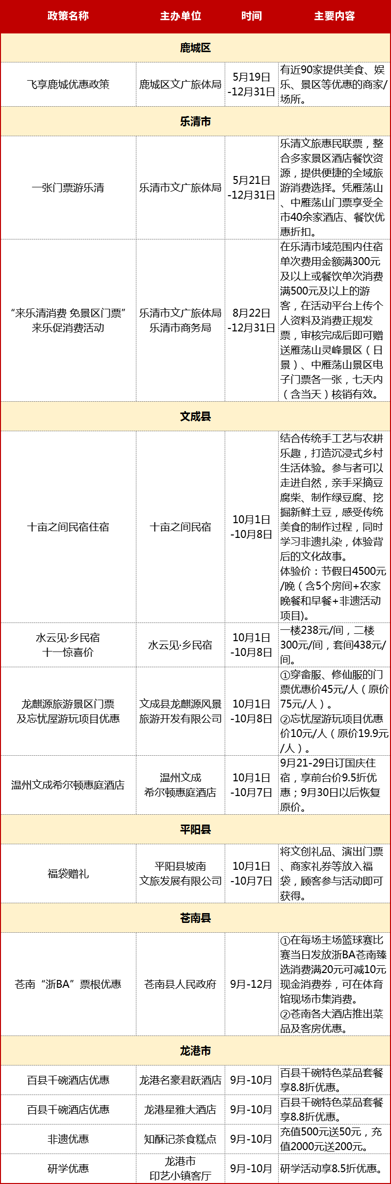 “C位好礼”大放送——比赛当日起3日内,购票观众、参赛球员、教练员(凭温州赛场实体门票、球员证、教练证),客场城市居民凭有效身份证或户口本(地址为客场地城市)前往相应景区景点、文旅企业即可享受温州文旅“C位好礼”。礼包包含34项景区(景点)福利,覆盖酒店民宿、餐饮体验、非遗项目、研学活动等文旅消费特色优惠共72项(